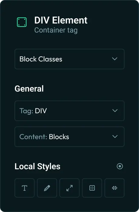 Instead of making a lot of blocks or even own environment, we decided to make everything as one key block that is called Elements. They are equal to HTML tags. You can connect it with any dynamic data